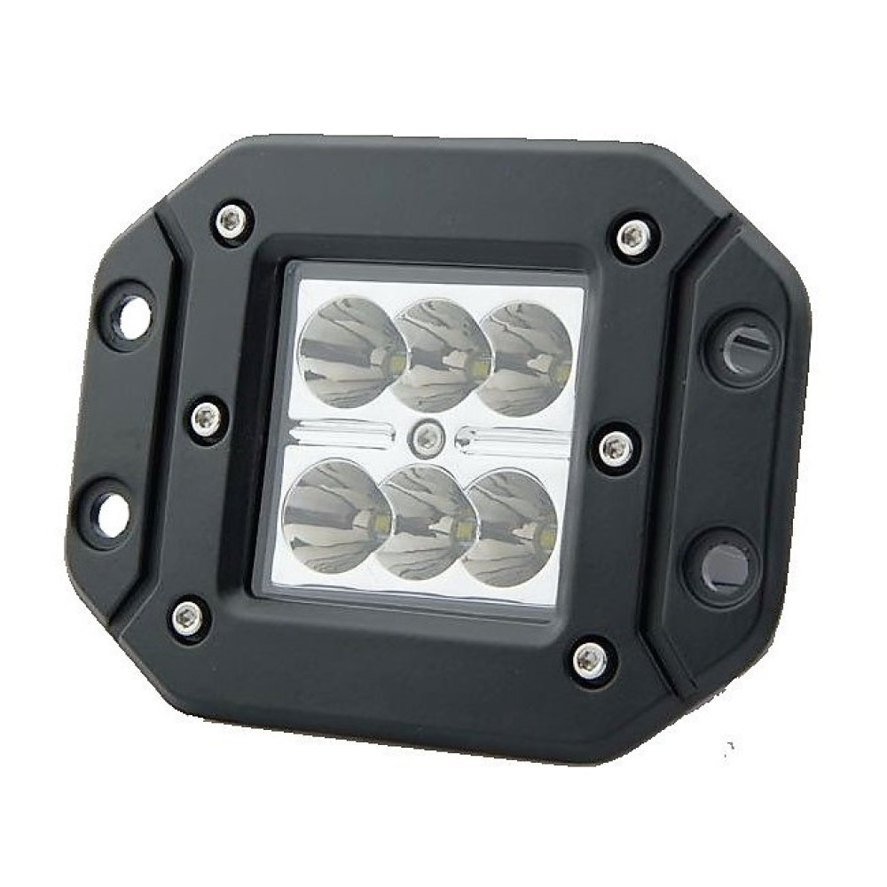 Врезная универсальная квадратная светодиодная фара рабочего света. Мощностью 18 Вт со светодиодами Cree с узким углом свечения (SPOT) в ударопрочном литом алюминиевом корпусе и с ударопрочной линзой из поликарбоната с пылевлагозащитой IP67 и работоспособностью при температуре от -40 до +50 градусов.