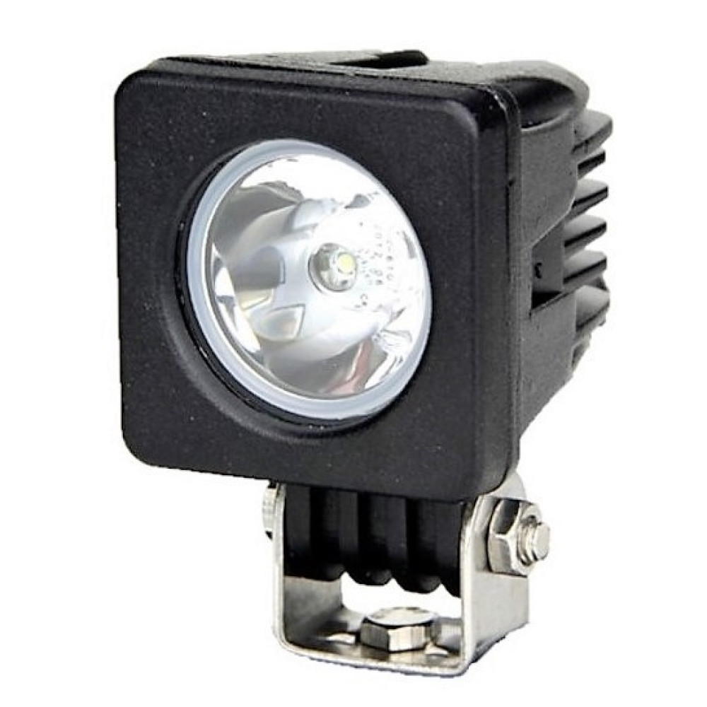 Универсальная квадратная светодиодная фара рабочего света с нижнем крепежом, мощностью 10 Вт со светодиодами Cree с узким углом свечения (SPOT) в ударопрочном литом алюминиевом корпусе и с ударопрочной линзой из поликарбоната с пылевлагозащитой IP67 и работоспособностью при температуре от -40 до +70 градусов.