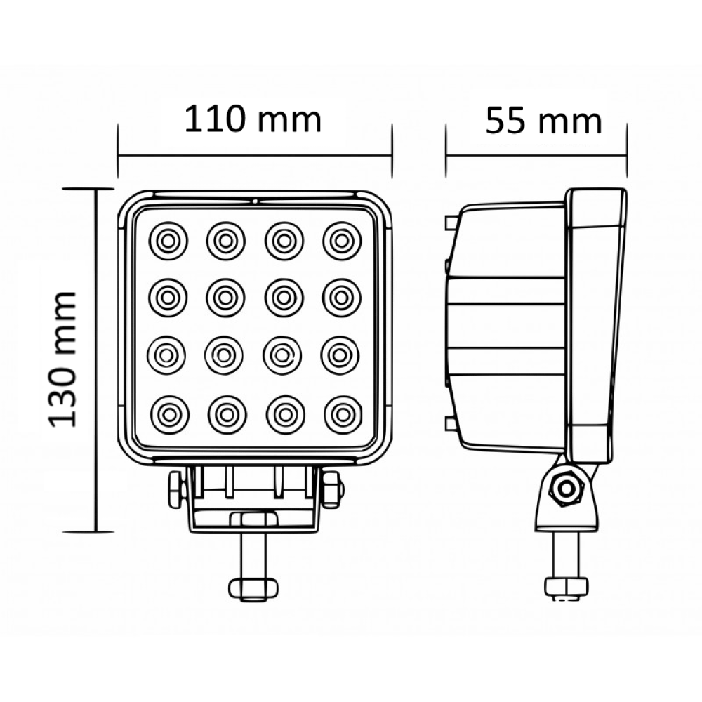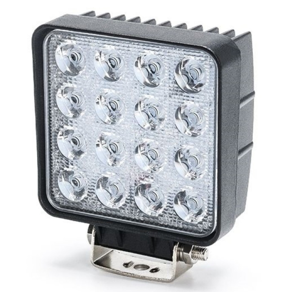 Универсальная квадратная светодиодная фара рабочего света с нижним креплением, мощностью 48 Вт на ярких светодиодах Epistar последнего поколения с широким углом свечения (FLOOD) в ударопрочном литом алюминиевом корпусе и с ударопрочной линзой из поликарбоната с пылевлагозащитой IP67 и работоспособностью при температуре от -40 до +50 градусов.