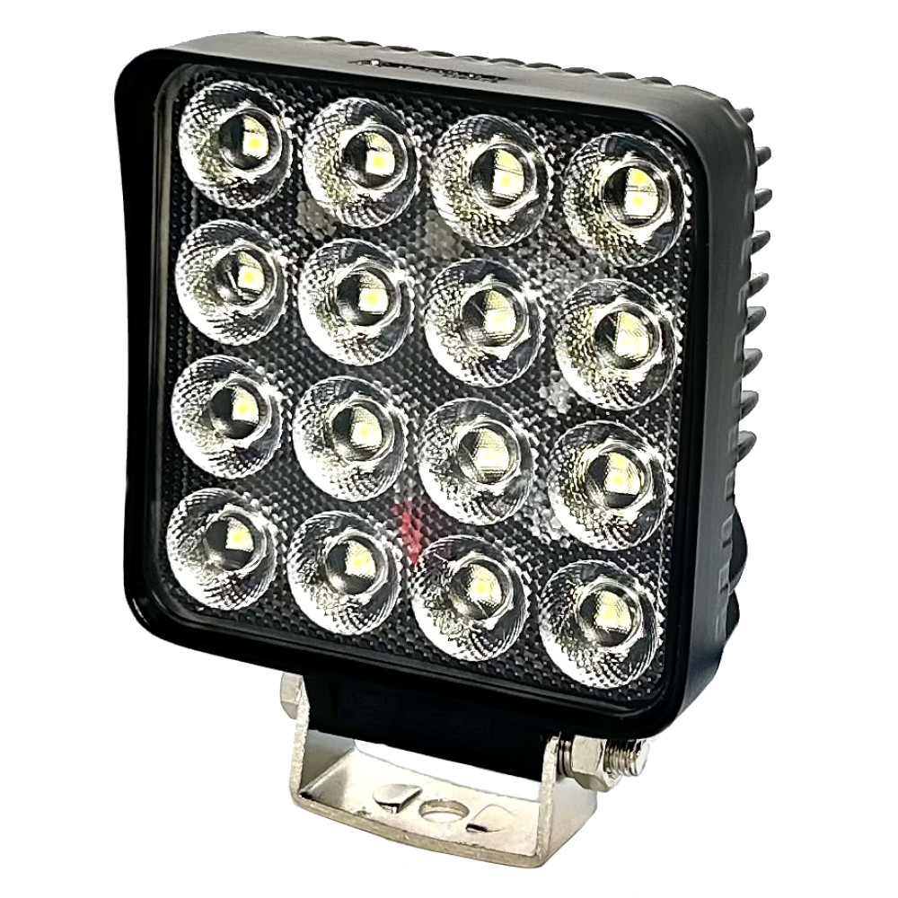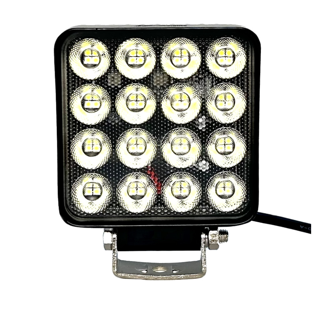 Универсальная квадратная светодиодная фара рабочего света с нижнем крепежом, мощностью 64 Вт на ярких светодиодах SMD последнего поколения с широким углом свечения (FLOOD) в ударопрочном литом алюминиевом корпусе и с ударопрочной линзой из поликарбоната с пылевлагозащитой IP67 и работоспособностью при температуре от -40 до +50 градусов.