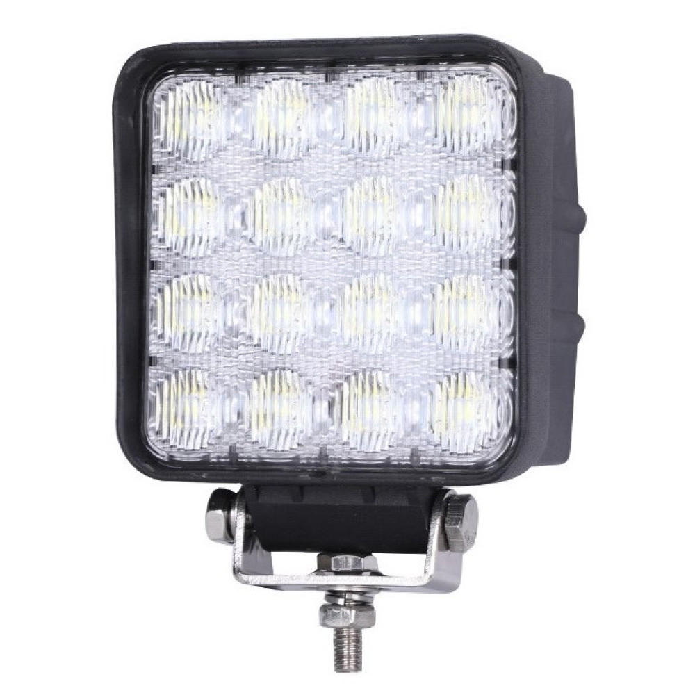 Универсальная квадратная профессиональная светодиодная фара рабочего света с нижним креплением, мощностью 48 Вт на ярких светодиодах CREE последнего поколения с широким углом свечения (FLOOD) в ударопрочном литом алюминиевом корпусе и с ударопрочной линзой из поликарбоната с пылевлагозащитой IP67 и работоспособностью при температуре от -40 до +50 градусов.