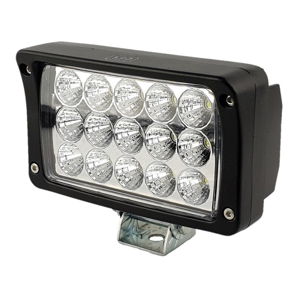 Универсальная прямоугольная светодиодная фара рабочего света с нижнем крепежом, мощностью 45 Вт на ярких светодиодах Epistar последнего поколения с широким углом свечения (FLOOD) в ударопрочном литом алюминиевом корпусе и с ударопрочной линзой из поликарбоната с пылевлагозащитой IP67 и работоспособностью при температуре от -40 до +50 градусов.